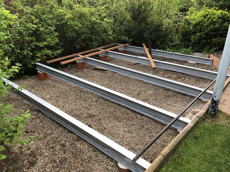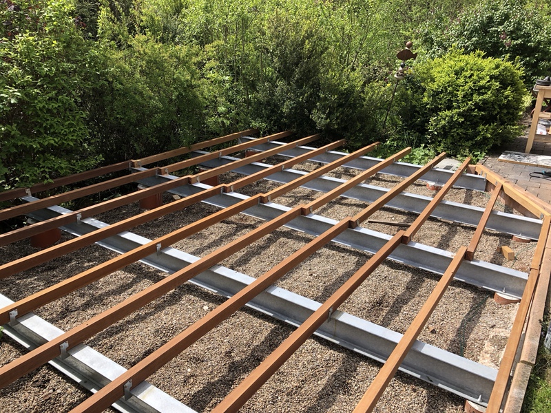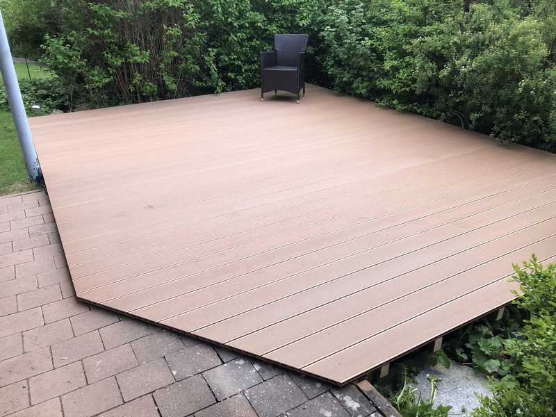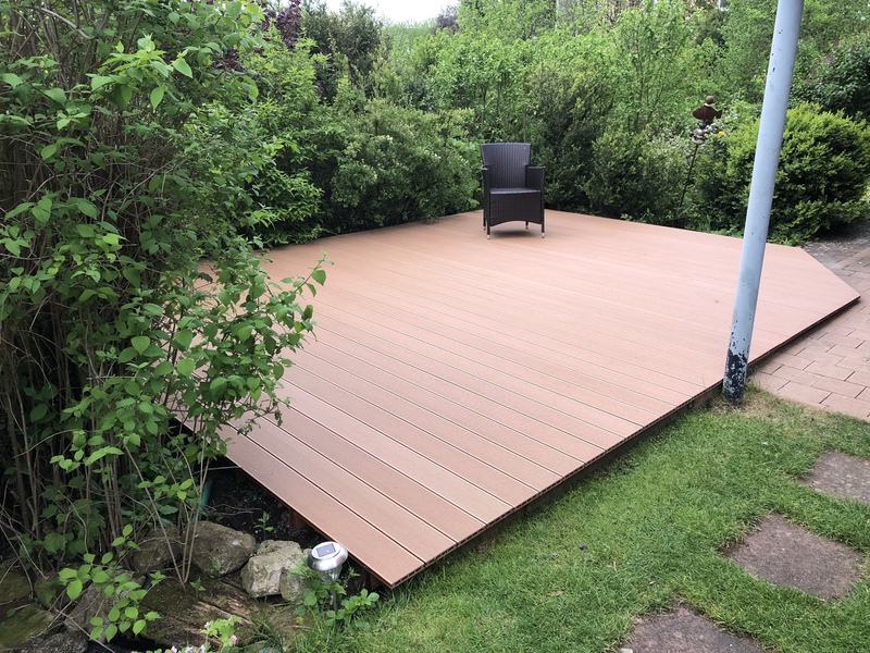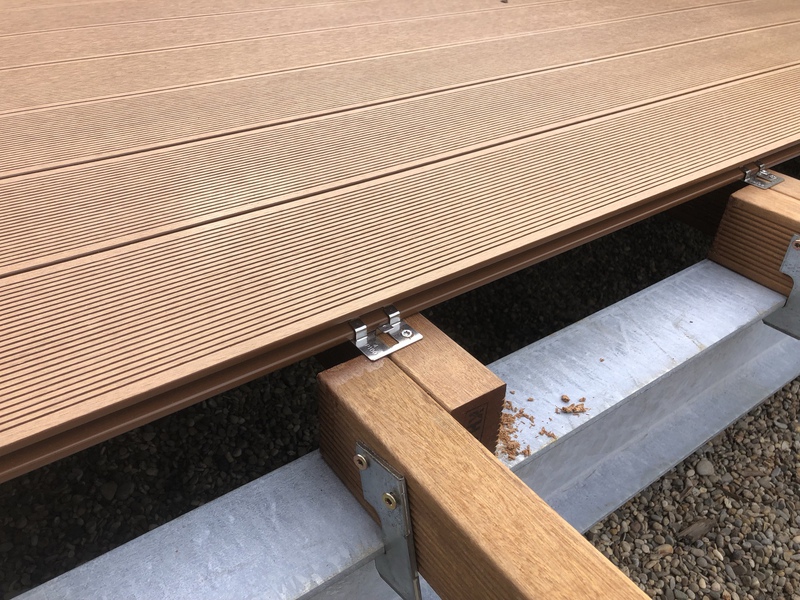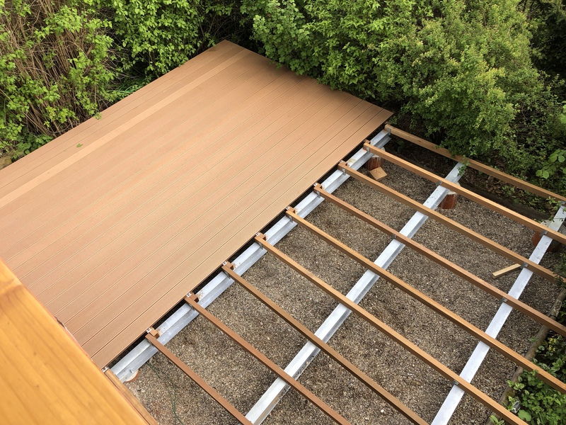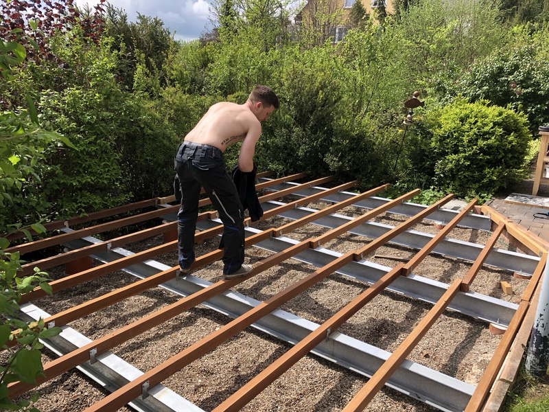Neue Terasse mit WPC-Paneelen, Holzunterbau auf Stahl-T-Träger.
